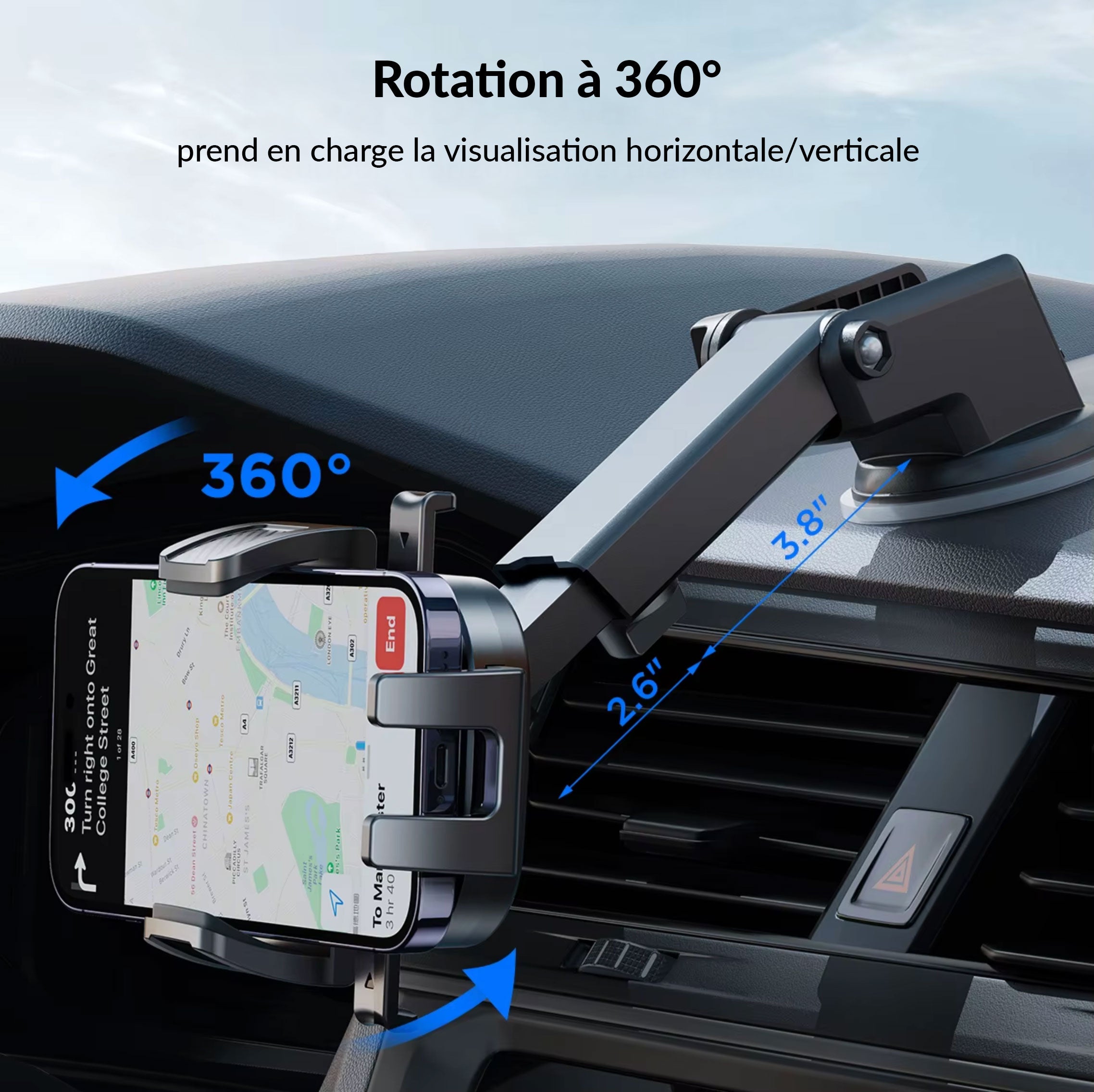 Ventouse ultra-adhérente — Fixation puissante sur le tableau de bord ou le pare-brise, stable même sur routes cahoteuses.
